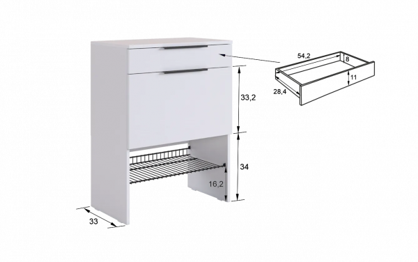 Изготовленная из прочного ЛДСП толщиной 16 мм, обувница обеспечивает надежность и долговечность. Выкатной ящик на шариковых направляющих позволяет легко и плавно открывать и закрывать его, предоставляя дополнительное место для хранения мелочей.