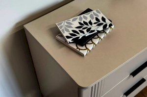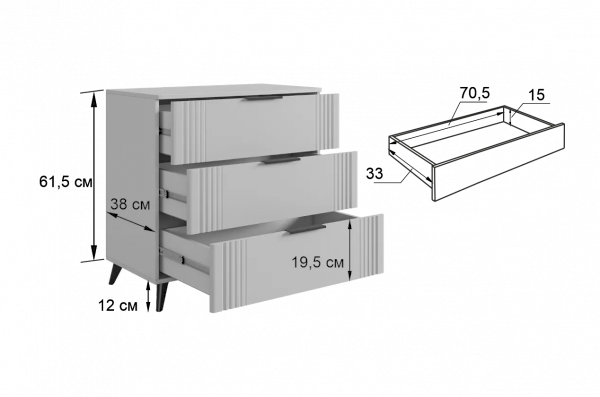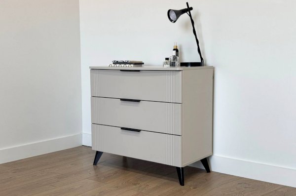 Комод изготовлен из качественных материалов: корпус выполнен из ЛДСП, что гарантирует прочность и долговечность, а фасад, выполненный из МДФ в плёнке ПВХ, не только выглядит эстетично, но и защищает комод от повреждений. Особое внимание заслуживает фрезеровка фасадов, которая придаёт изделию изысканный вид.